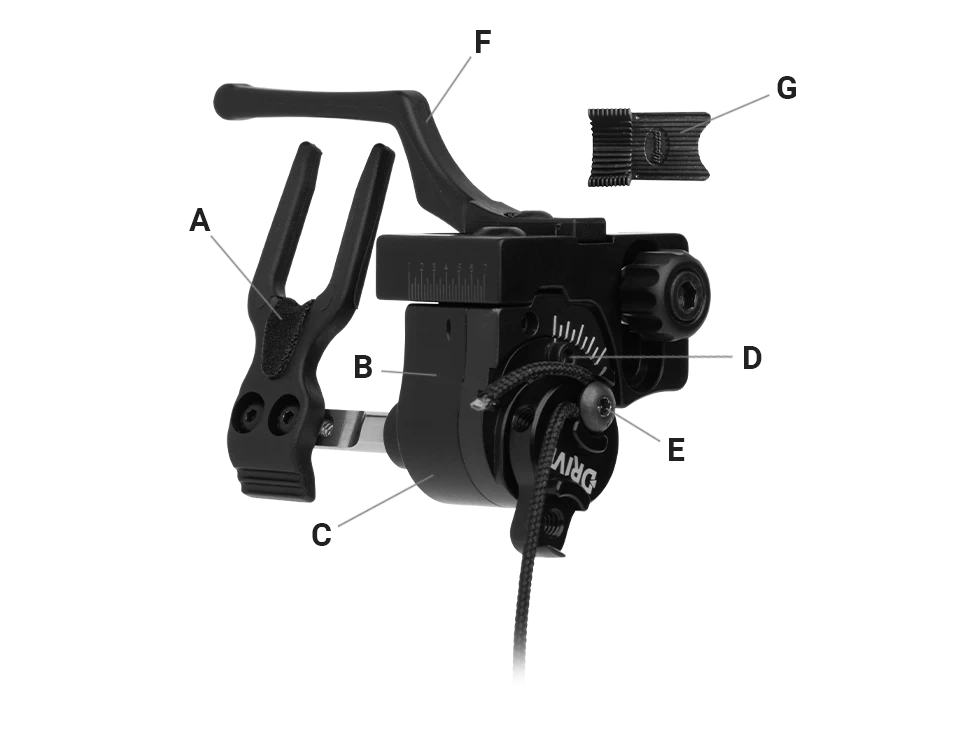 Le repose flèche Red X IMS est doté d’un support moulé silencieux (A) et d’un amortisseur interne (B). Le système d’entrainement à roulement permet fluidité et précision (C), l’angle du support est réglable (D) ainsi que la tension (E). La cordelette n’interfère pas avec le déplacement de la flèche enfin le système empêche la flèche de basculer du repose flèche (G).